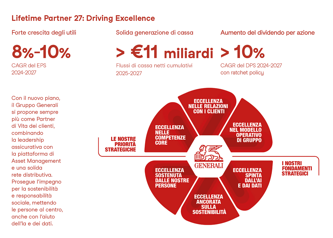 Basata sulla solida piattaforma costruita fin dal 2016 e sul superamento di tutti i principali obiettivi finanziari del piano 2022-2024, la nuova strategia di Generali è focalizzata sul guidare l’eccellenza nelle relazioni con i clienti, nelle competenze core del business assicurativo e dell’asset management e nel suo modello operativo. Inoltre, il piano si basa sulle potenzialità delle persone del Gruppo, sull’intelligenza artificiale e i dati, e sulla sostenibilità.